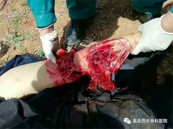 到达现场后,发现了惨不忍睹的一幕,韩某右下肢,几乎被机械吞噬,剩余好的皮肤组织寥寥无几,经过检查,发现患者右膝关节开放性脱位,右侧小腿大面积皮肤撕脱伤,小腿不全离断伤,下肢血管、神经断裂,右踝部皮肤撕脱伤,左侧膝关节脱位伴外侧副韧带,前、后交叉韧带断裂,右手皮肤撕脱伤,头外伤。
